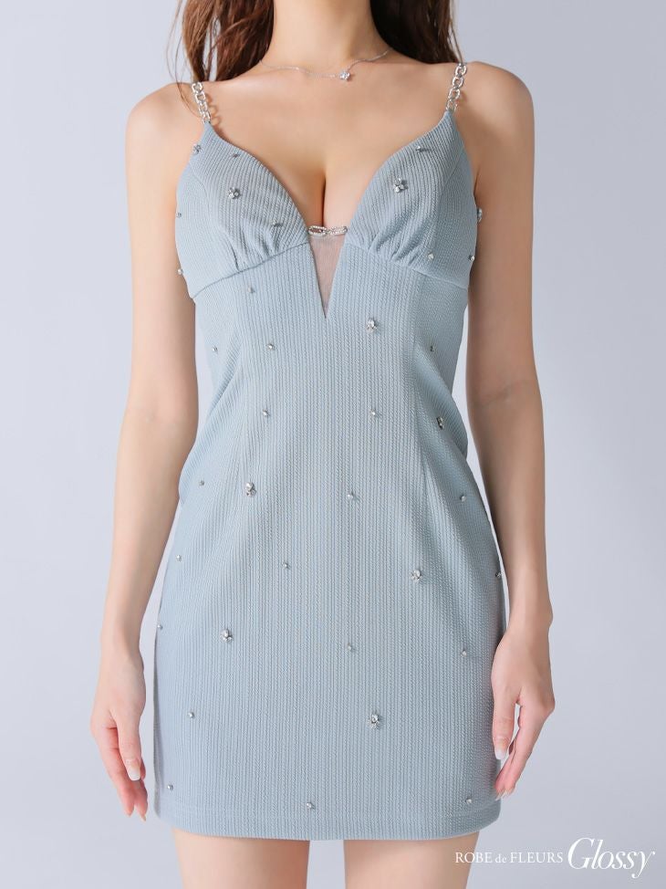 シンプルデザインで大人っぽく☆ [ROBEdeFLEURSGlossy/ローブドフルールグロッシー] 高級 ワンカラー ビジュー リブニット バストシースルー キャミソール 谷間魅せ タイトミニドレス