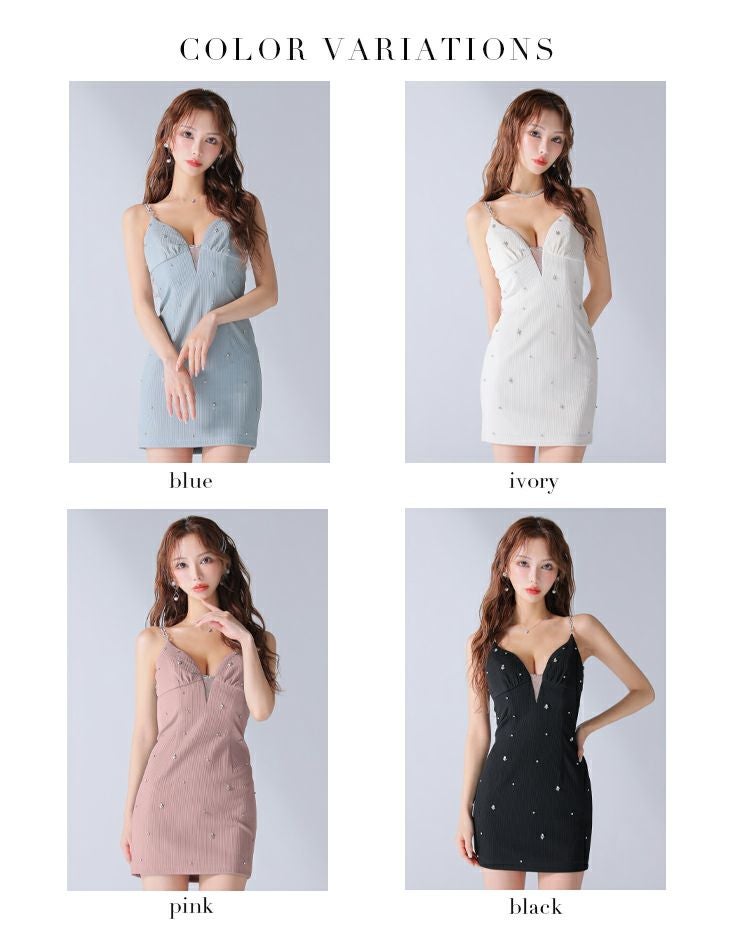 4. [ROBEdeFLEURSGlossy/ローブドフルールグロッシー] 高級 ワンカラー ビジュー リブニット バストシースルー キャミソール 谷間魅せ タイトミニドレス