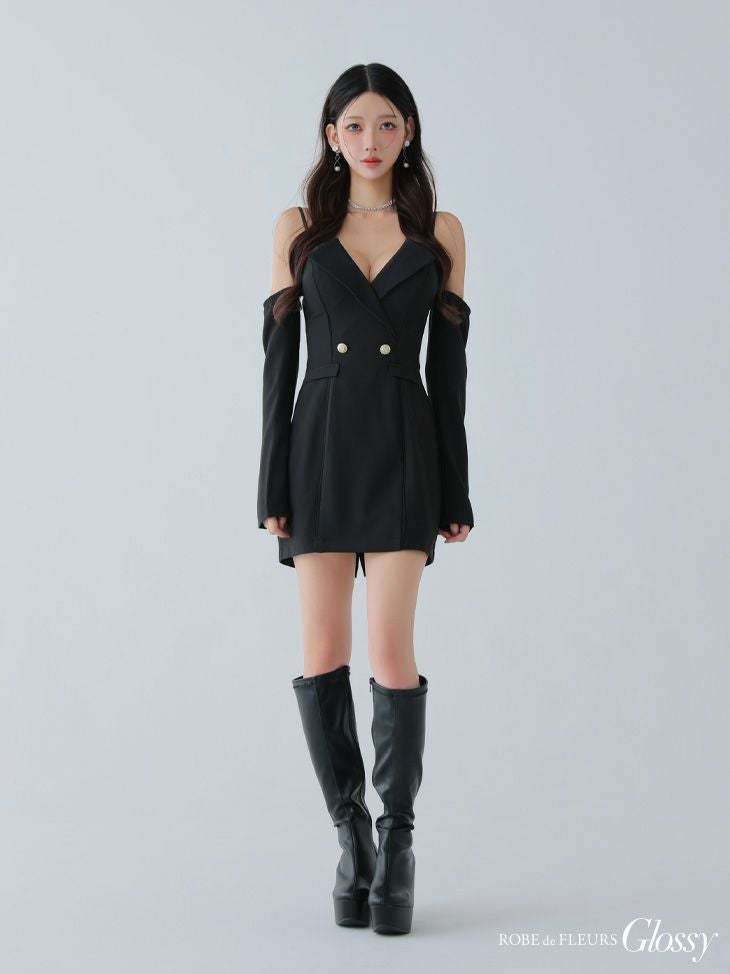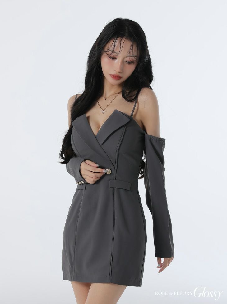 6. [ROBEdeFLEURSGlossy/ローブドフルールグロッシー] 高級 肩出し 二の腕カバー 2way 長袖 袖あり テーラード風デザイン 谷間魅せ タイトミニドレス