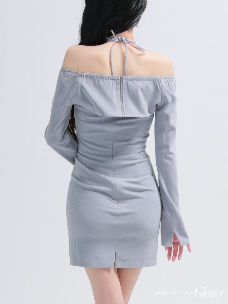 ワンカラーながらも色気溢れる♡ [ROBEdeFLEURSGlossy/ローブドフルールグロッシー] 高級 ブランド タイトミニドレス 長袖 ボレロ ホルターネック 2way スエード ギャザー