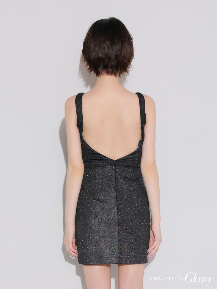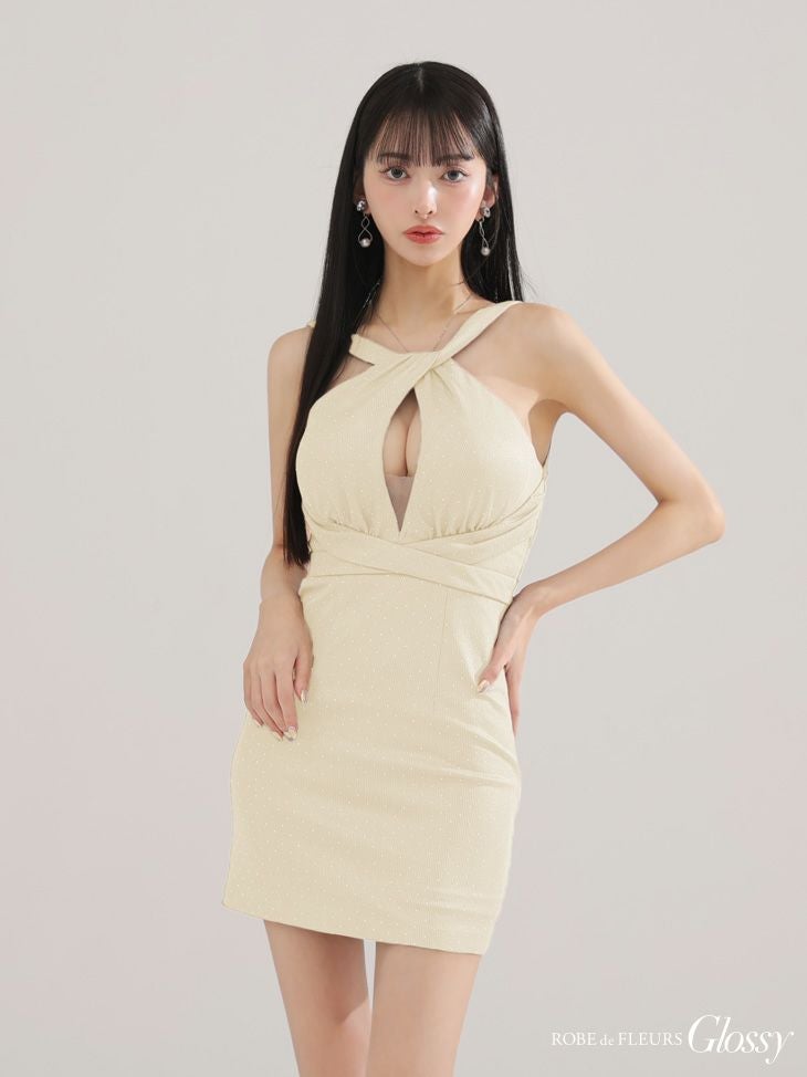 4. [ROBEdeFLEURSGlossy/ローブドフルールグロッシー] 高級 クロスデザイン ホルターネック ストーン ドット柄 ラメニット バストカット タイトミニドレス