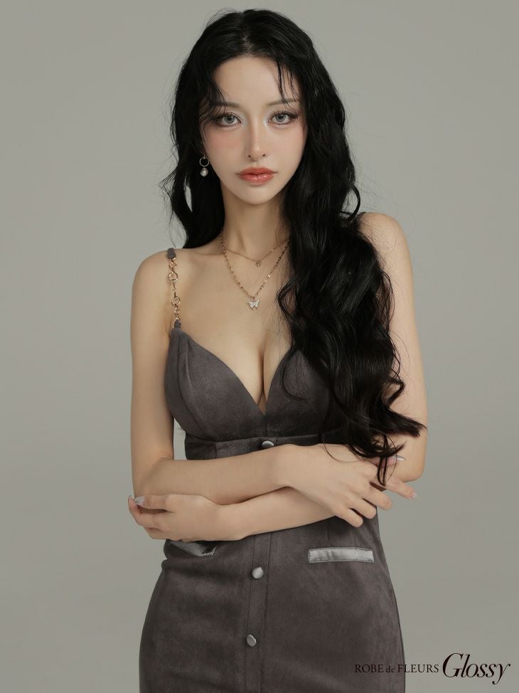 谷間を大胆にアピール♡ [ROBEdeFLEURSGlossy/ローブドフルールグロッシー] 高級 ブランド タイトミニドレス キャミソール 谷間 ショルダーチェーン フェイクスエード ボタン ワンカラー
