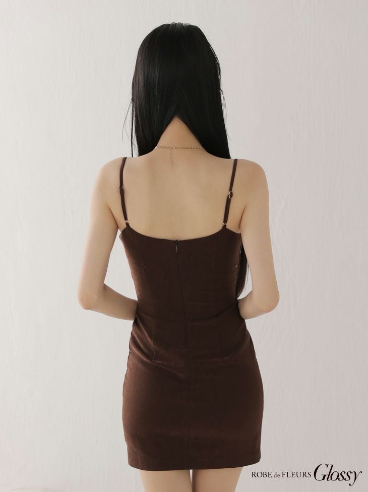 4. [ROBEdeFLEURSGlossy/ローブドフルールグロッシー] 高級 ブランド タイトミニドレス キャミソール 谷間 ショルダーチェーン フェイクスエード ボタン ワンカラー