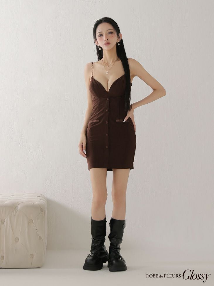 5. [ROBEdeFLEURSGlossy/ローブドフルールグロッシー] 高級 ブランド タイトミニドレス キャミソール 谷間 ショルダーチェーン フェイクスエード ボタン ワンカラー