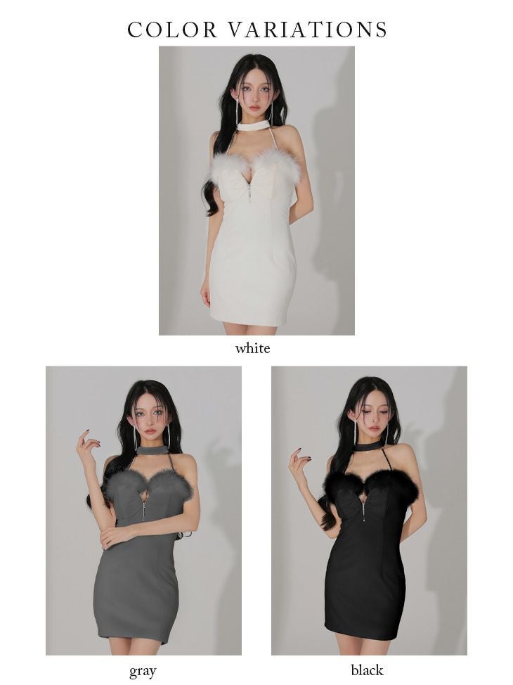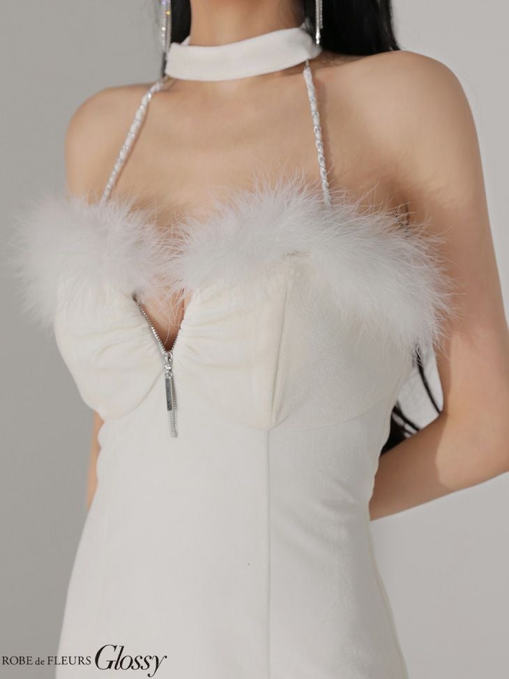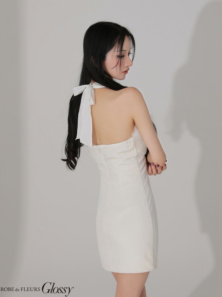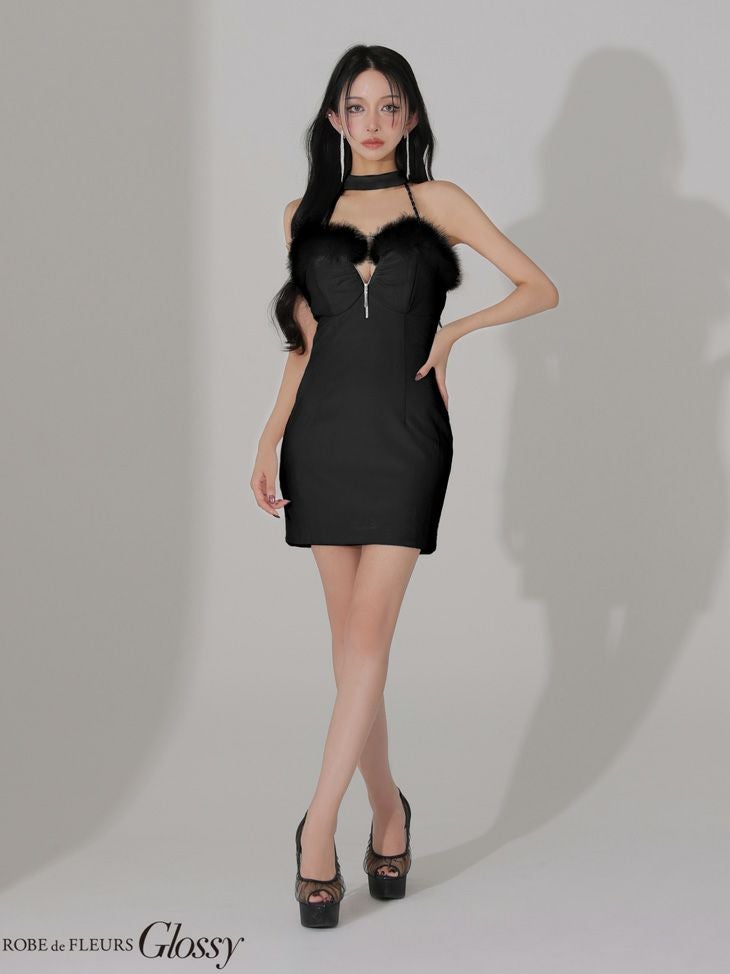 華やかなファーが目を惹く♡ [ROBEdeFLEURSGlossy/ローブドフルールグロッシー] 高級 ブランド タイトミニドレス 谷間 背中魅せ ホルターネック ジップ ファー ベロア