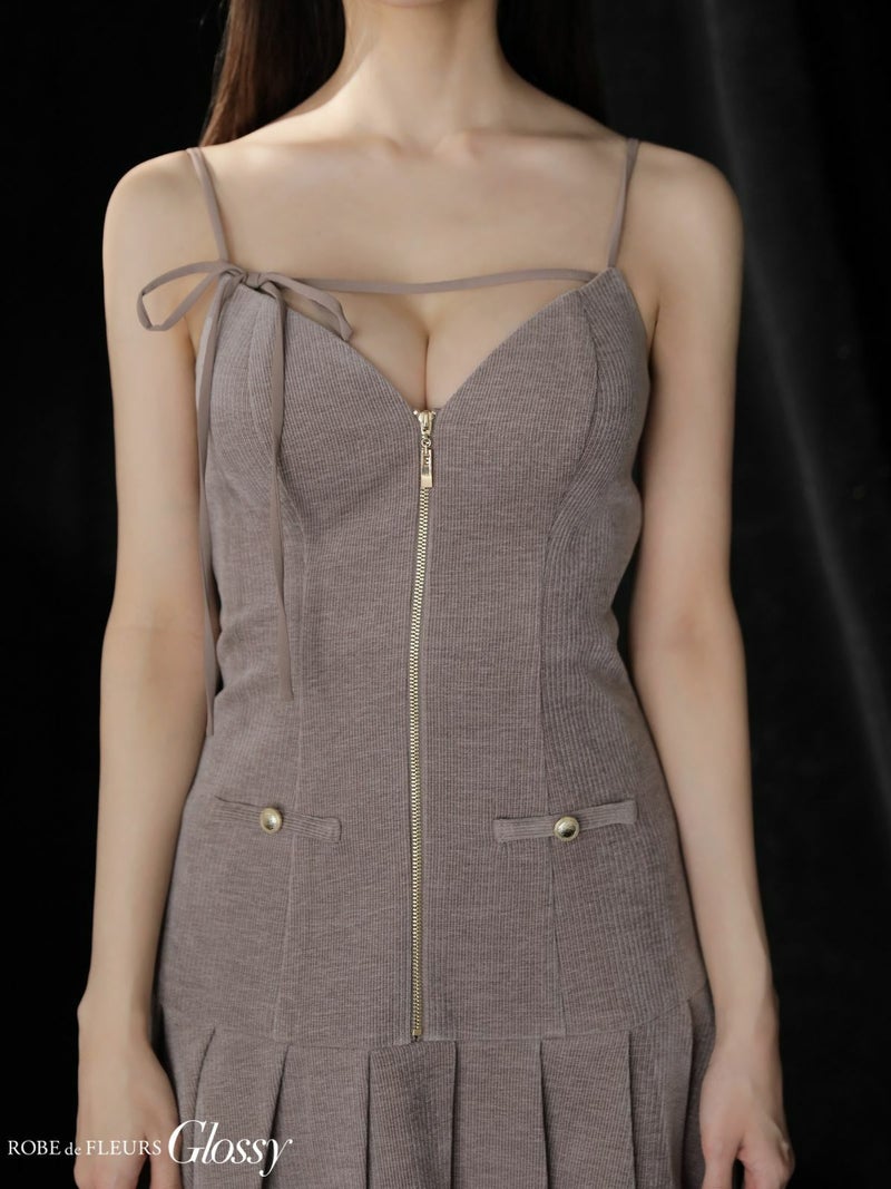 大胆なバックスタイルでsexyに♡ [ROBEdeFLEURSGlossy/ローブドフルールグロッシー] 高級 ブランド Aラインミニドレス 谷間 キャミソール 背中魅せ バストリボン ジップ プリーツ コーデュロイ