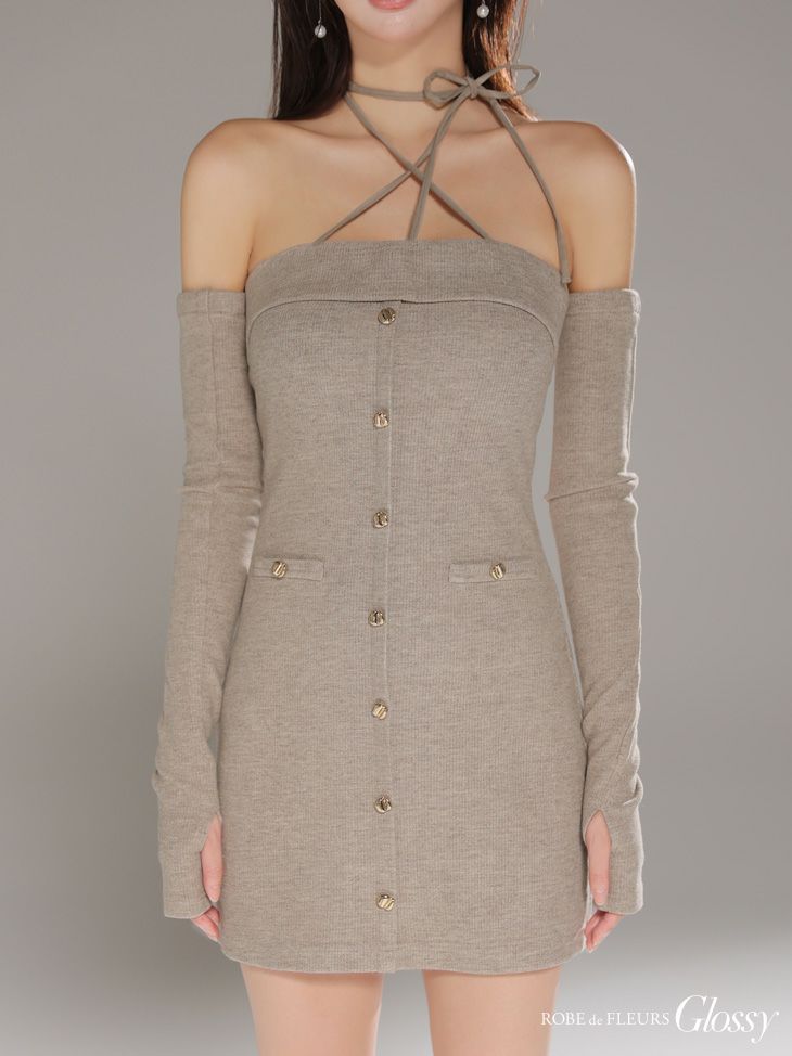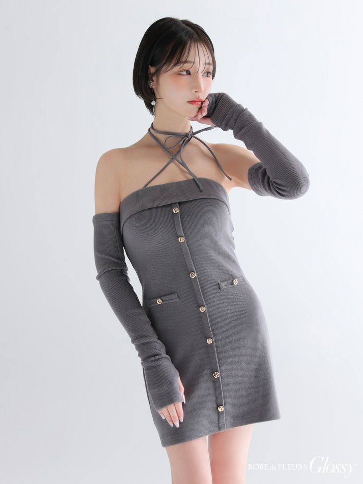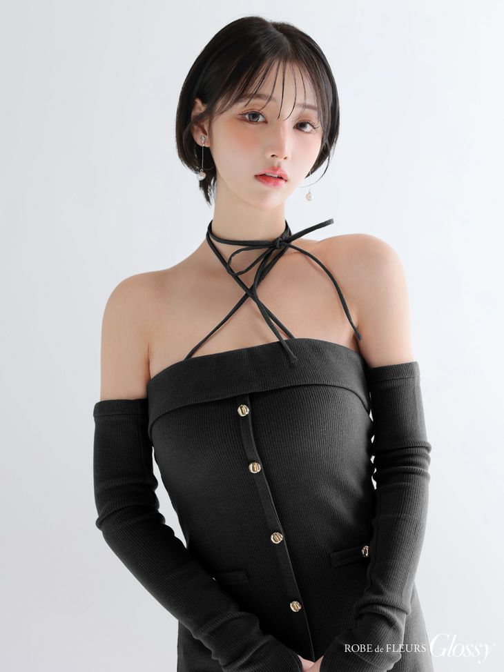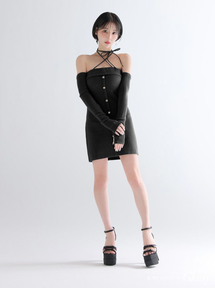 シンプルながらも目を惹く♡ 予約商品【2月上旬入荷予定】[ROBEdeFLEURSGlossy/ローブドフルールグロッシー] 高級 ブランド タイトミニドレス 長袖 袖あり ネックリボン アームウォーマー付き ベアデザイン フロントボタン