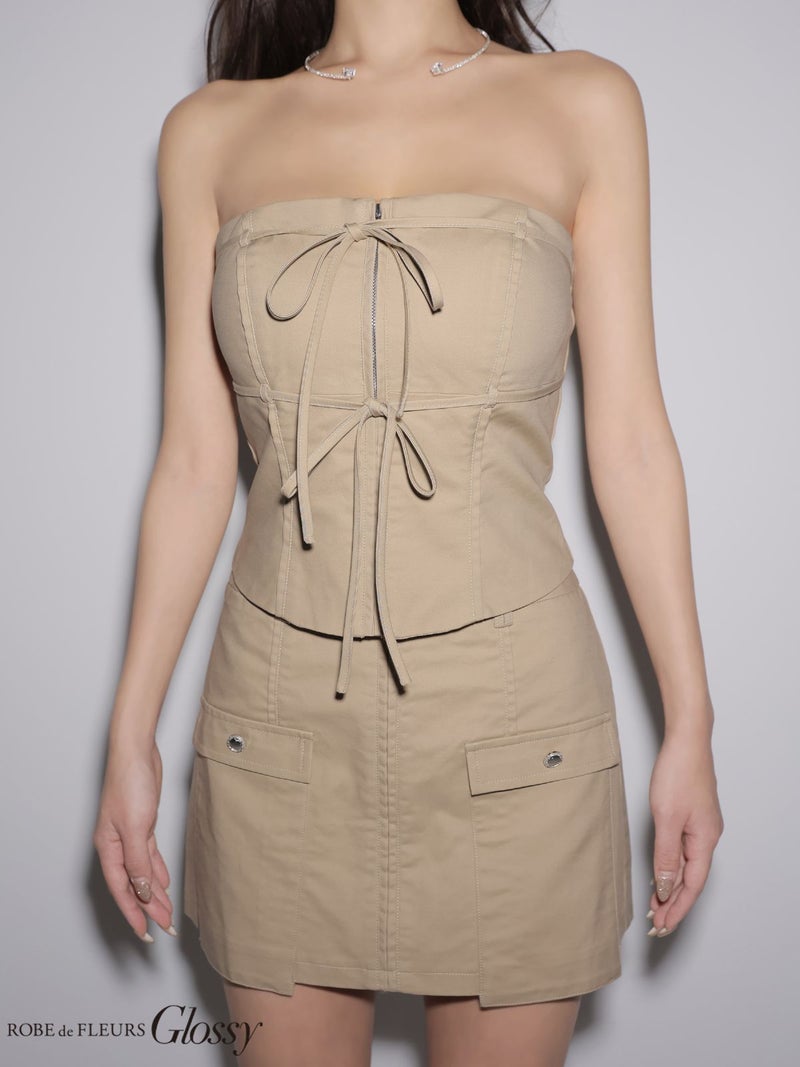 ベアデザインでヘルシーに肌見せ♡ [ROBEdeFLEURSGlossy/ローブドフルールグロッシー] 高級 ブランド タイトミニドレス 谷間 セットアップ ベア ジップ リボン ワンカラー