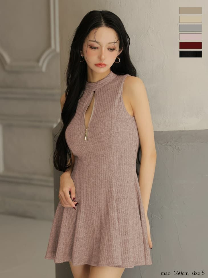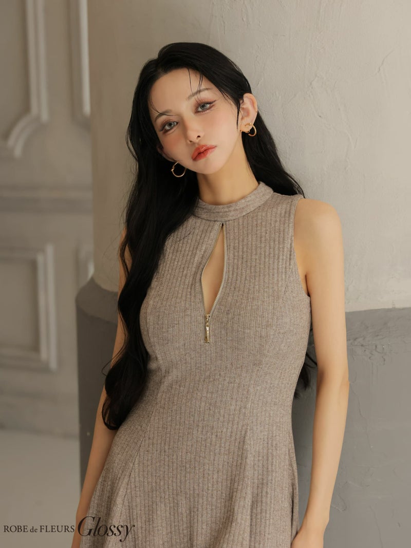 フレアラインで女性らしい美シルエットに♡ [ROBEdeFLEURSGlossy/ローブドフルールグロッシー] 高級 ブランド Aラインミニドレス 胸元カバー 谷間 ノースリーブ ジップ ハイネック ラメニット (せな着用)