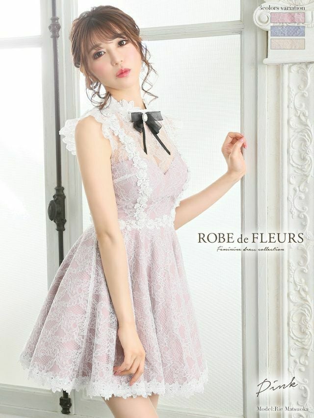 キャバドレス ミニドレス [SALE] [ROBEdeFLEURS/ローブドフルール] 高級首元リボンフリル袖総レースフレアミニドレス
