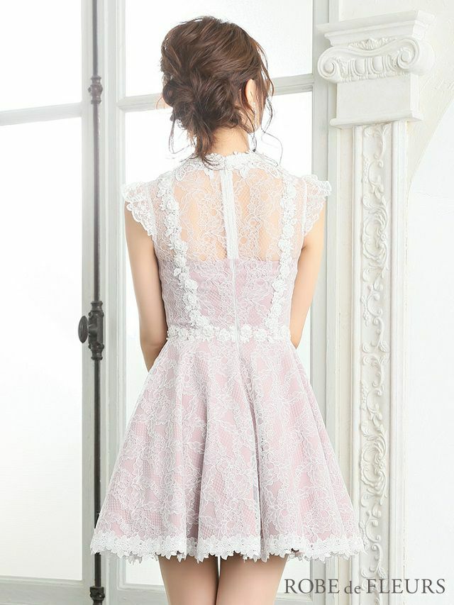 パステルカラーに総レースデザインでラブリー感たっぷり☆ [ROBEdeFLEURS/ローブドフルール] 高級首元リボンフリル袖総レースフレアミニドレス
