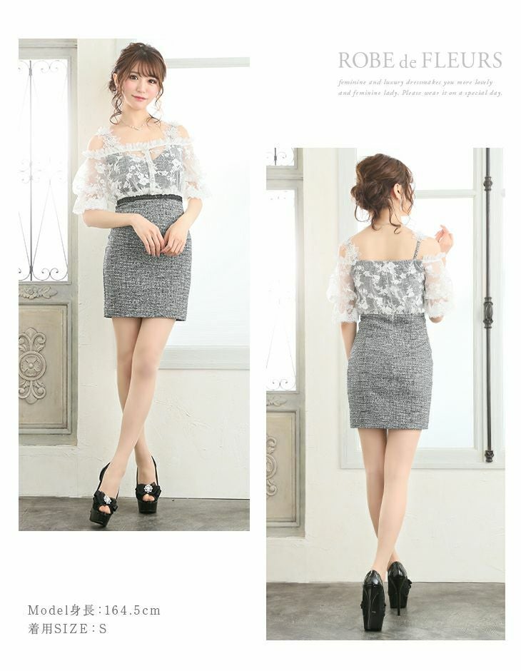 タイトなドレスと花柄レースが大人シックなミニドレス☆ [ROBEdeFLEURS/ローブドフルール] 高級ラメツイード×肩出し 二の腕カバータイトミニドレス