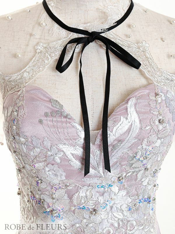 パールチュール×フラワーレースで上品☆ [ROBEdeFLEURS/ローブドフルール] 高級ネックリボンパールスリーブ×フラワーレースタイトミニドレス