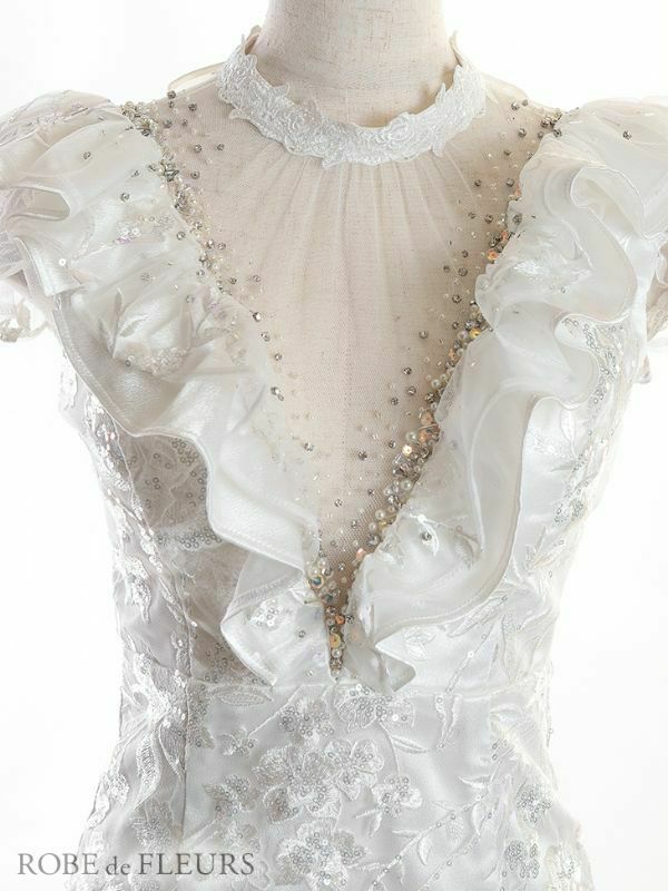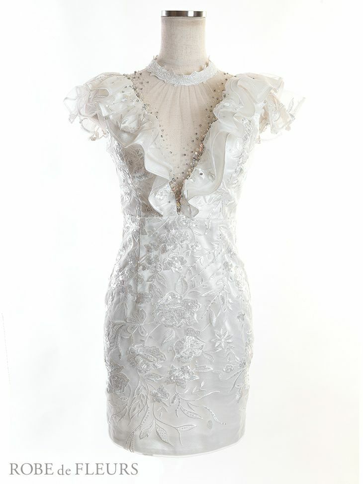 ボリュームたっぷりのフリルがフェミニン☆ [ROBEdeFLEURS/ローブドフルール] 高級ビジューラインVカット×フリル半袖タイトミニドレス