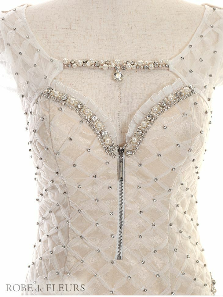 胸元のビジューチェーンでセクシーさも演出◎ [ROBEdeFLEURS/ローブドフルール] 高級ダイヤチュールxラメサテンノースリーブタイトミニドレス