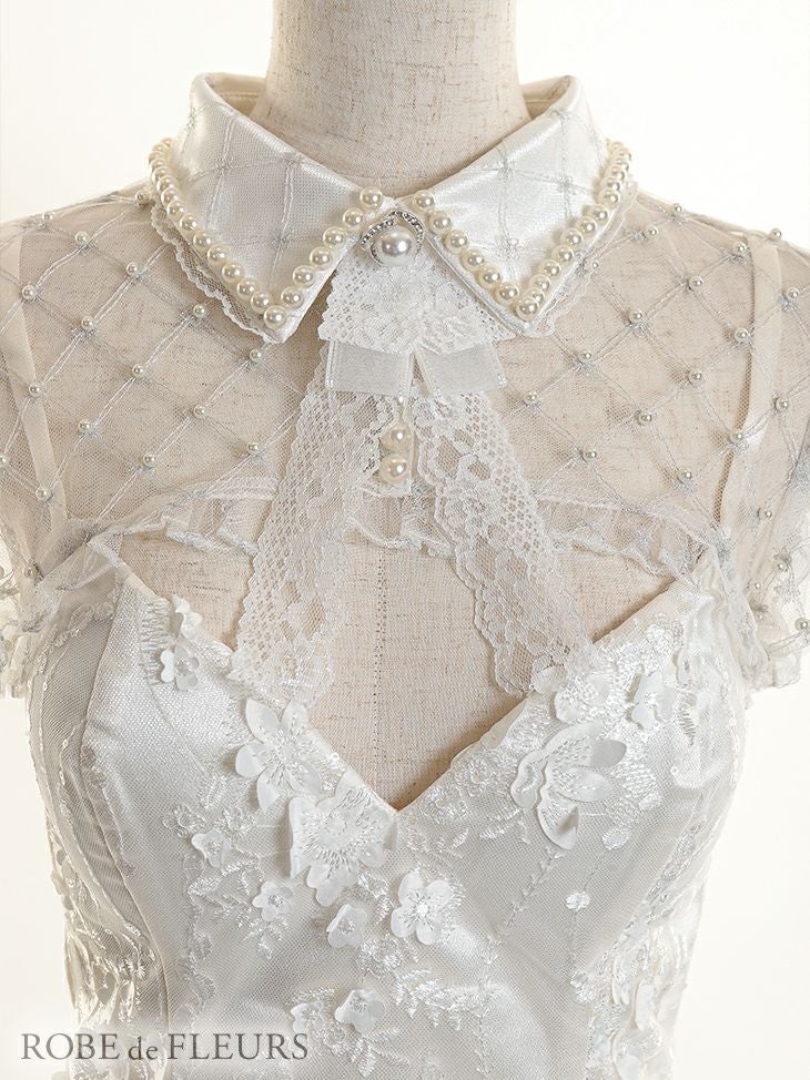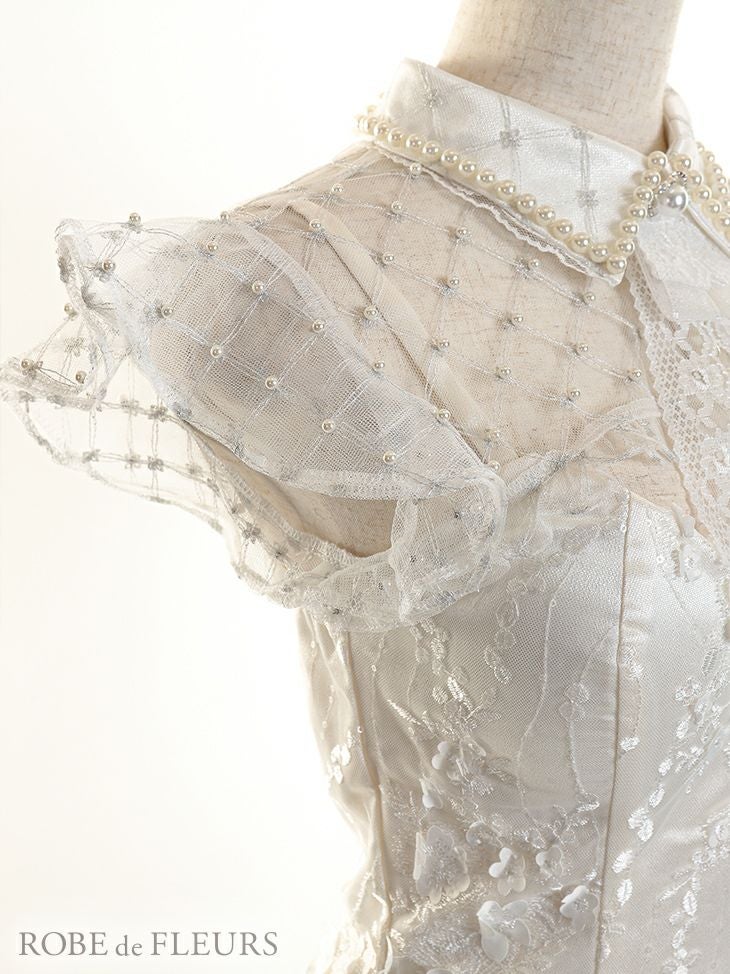 あざと可愛い上品ガーリースタイル☆ [ROBEdeFLEURS/ローブドフルール] 高級襟付きラメチュールフリル袖立体フラワーレースタイトミニドレス