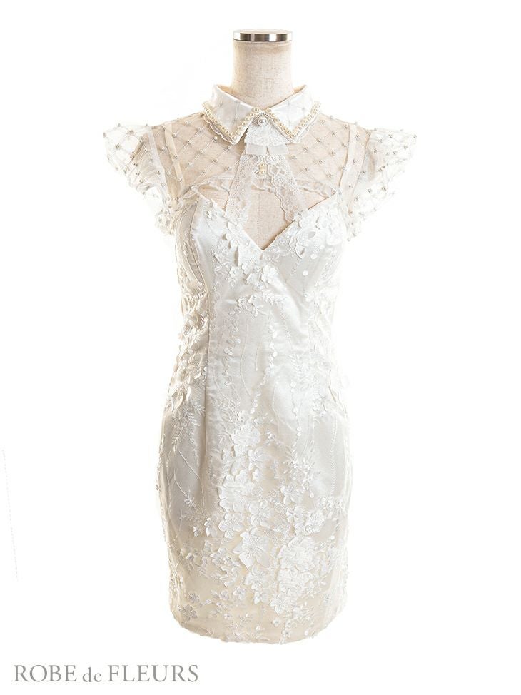 4. [ROBEdeFLEURS/ローブドフルール] 高級襟付きラメチュールフリル袖立体フラワーレースタイトミニドレス