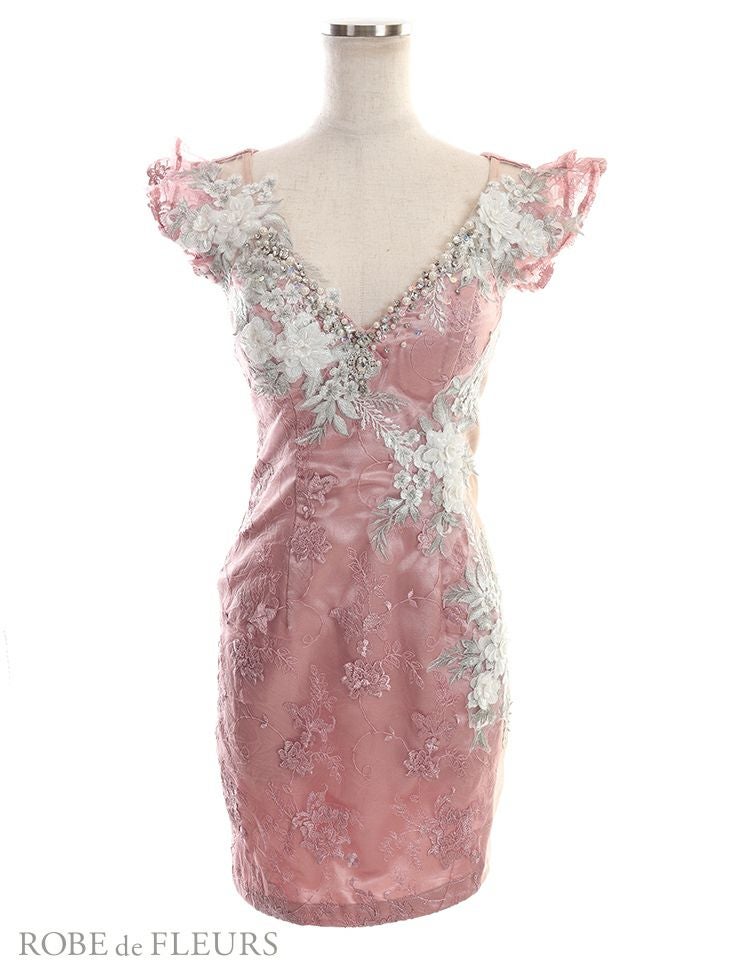キラキラビジュー付きで店内でも映える☆ [ROBEdeFLEURS/ローブドフルール] 高級フラワー刺繍フリル袖キラキラビジュー付きタイトミニドレス
