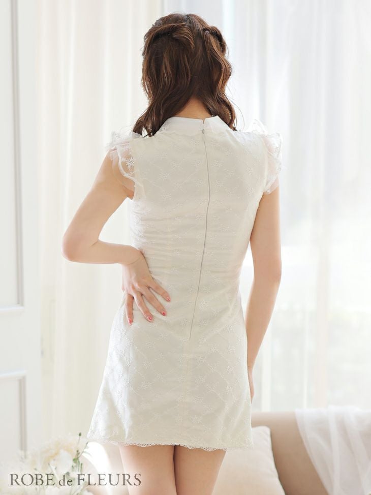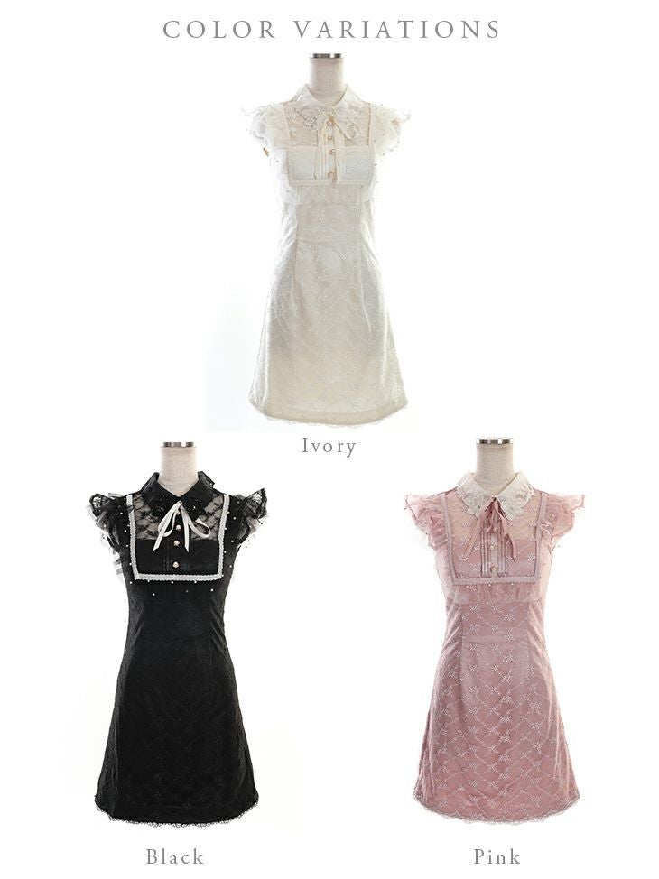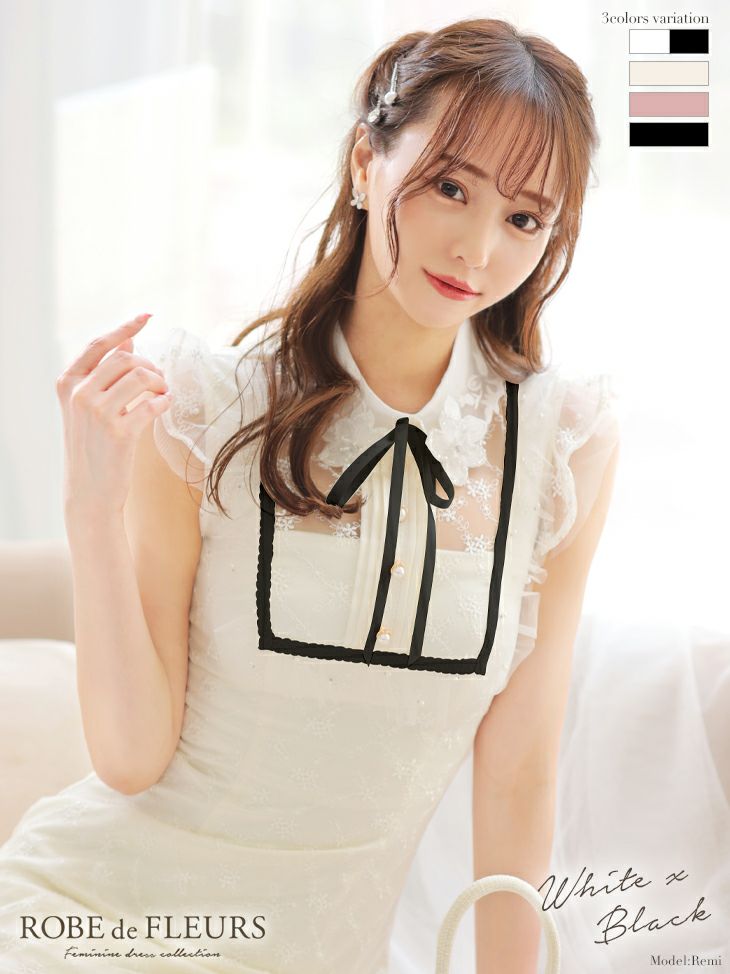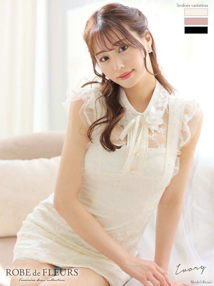 3. [ROBEdeFLEURS/ローブドフルール] 高級 襟付き ネックリボン 刺繍フラワーレース サロペ風 フリル袖 ノースリーブ 台形 フレアミニドレス