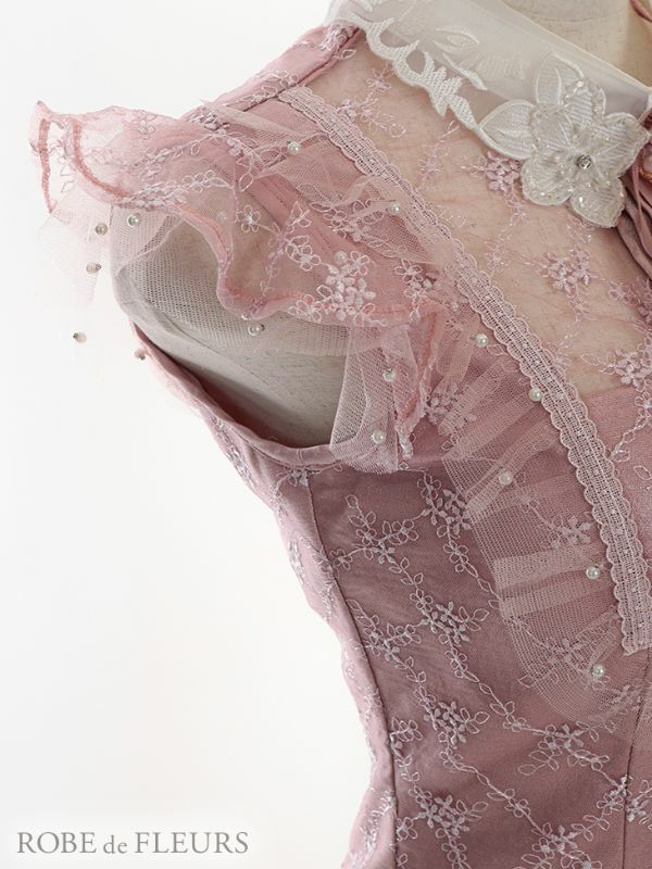 5. [ROBEdeFLEURS/ローブドフルール] 高級 襟付き ネックリボン 刺繍フラワーレース サロペ風 フリル袖 ノースリーブ 台形 フレアミニドレス