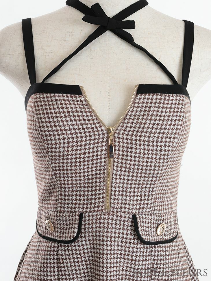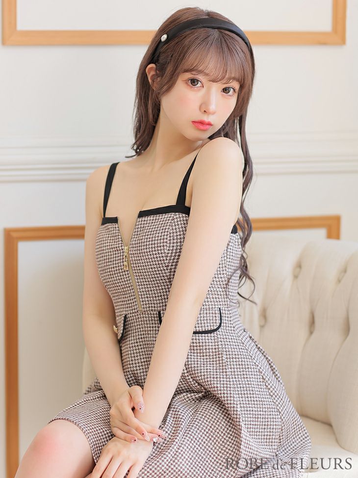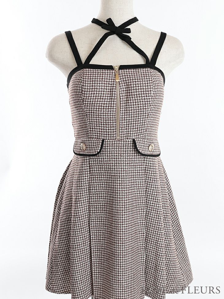 バスト部分のチョーカーは取り外し可能☆ [ROBEdeFLEURS/ローブドフルール] 高級チョーカーリボンキャミソール千鳥格子柄バストジップツイードフレアミニドレス