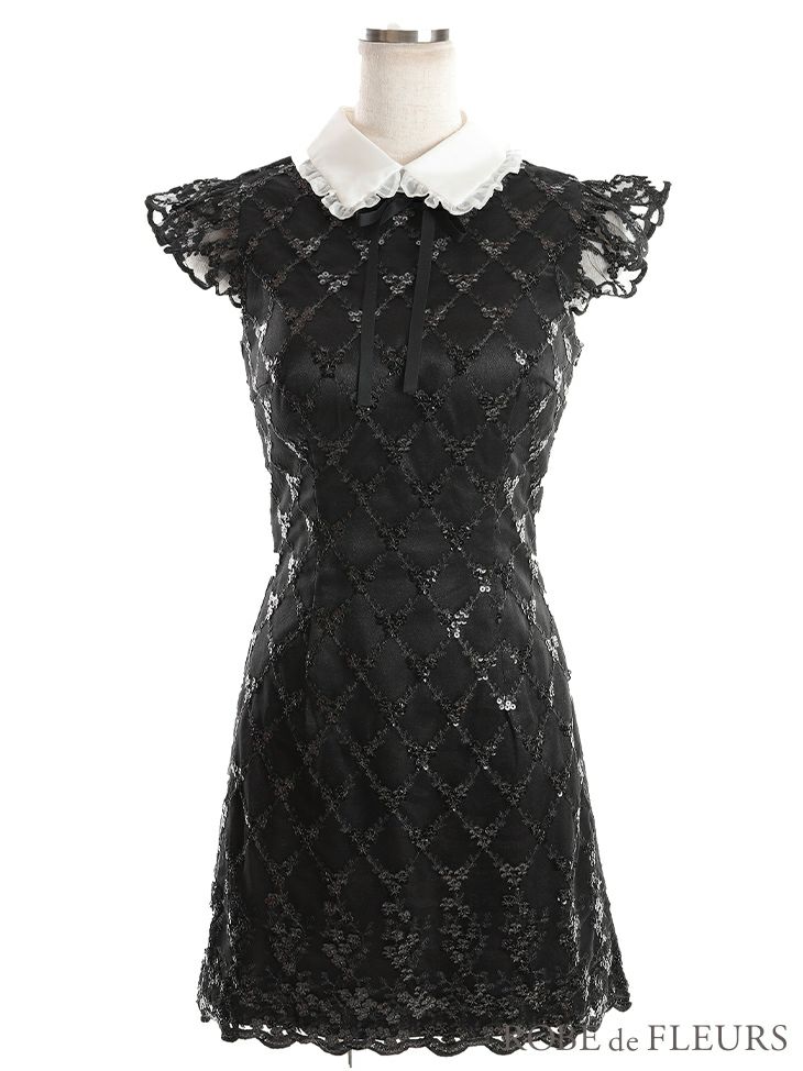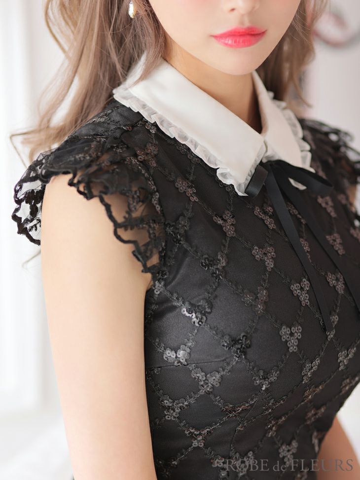 同伴やお食事会などにも◎ [ROBEdeFLEURS/ローブドフルール] 高級 ビーズレース ネックリボン 襟付き フリル袖 ノースリーブ フレアミニドレス