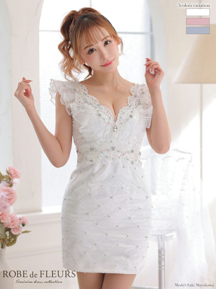 ガーリーでセクシーな一着☆ [ROBEdeFLEURS/ローブドフルール] 高級フリルスリーブブロックチュールフラワーモチーフパールビジューノースリーブミニドレス