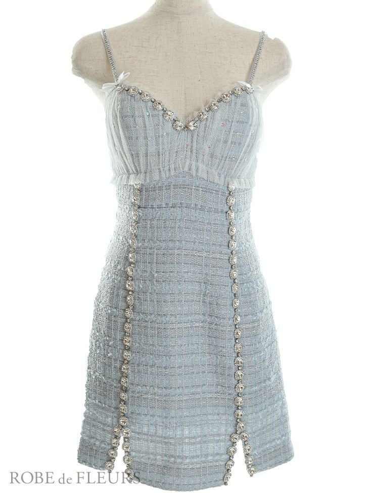 ガーリーさが詰め込まれた一着☆ [ROBEdeFLEURS/ローブドフルール] 高級ツイードバストチュールリボンラインビジューキャミソールタイトミニドレス
