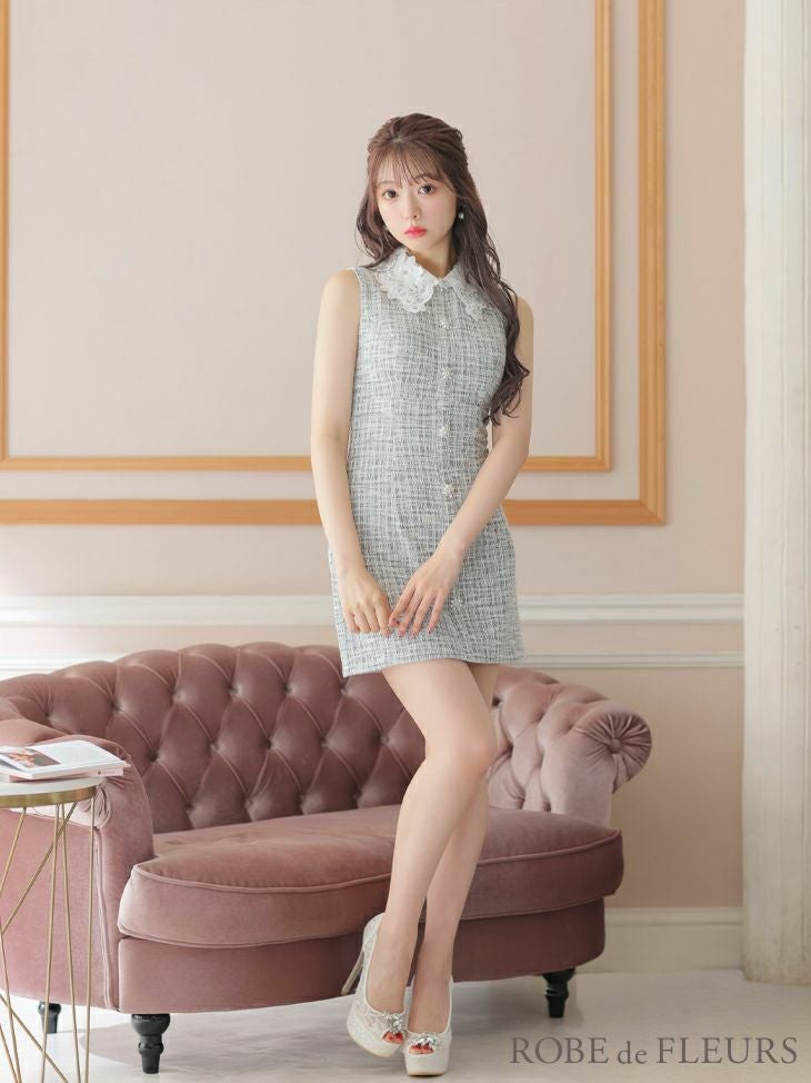 女性らしい印象でガーリー☆ [ROBEdeFLEURS/ローブドフルール] 高級ノースリーブニット襟付きツイードタイトミニドレス