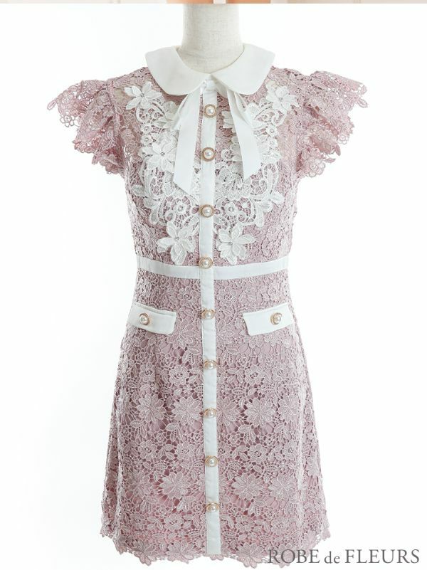 5. [ROBEdeFLEURS/ローブドフルール] 高級 ネックリボン 襟付き バイカラー フラワー刺繍レース ノースリーブ タイトミニドレス