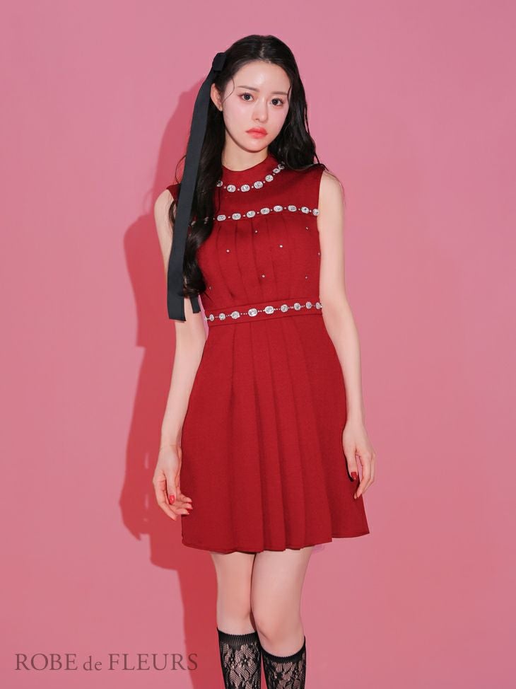 5. [ROBEdeFLEURS/ローブドフルール] 高級ツイードノースリーブオフネックビジューフレアミニドレス