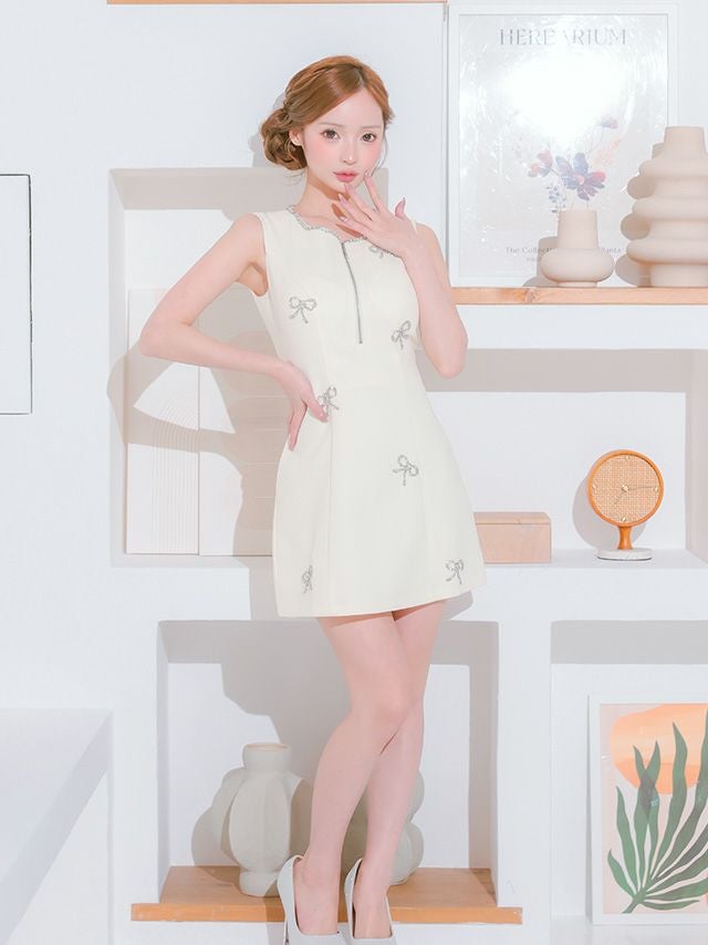 清楚な可愛さをアピール♡ [ROBEdeFLEURS/ローブドフルール] 高級 ブランド Aラインミニドレス ノースリーブ ビジュー リボン ジップ (れむ着用)