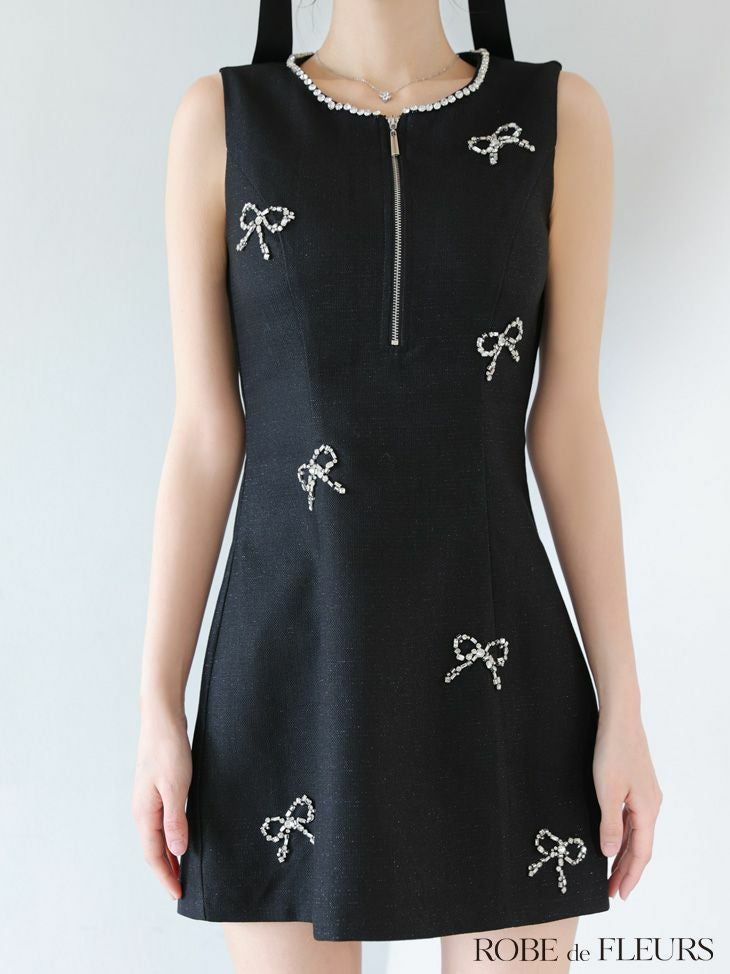 3. [ROBEdeFLEURS/ローブドフルール] 高級 ブランド Aラインミニドレス ノースリーブ ビジュー リボン ジップ (れむ着用)