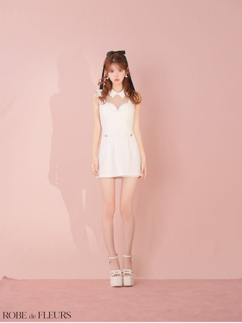 4. [ROBEdeFLEURS/ローブドフルール] 高級 ブランド タイトミニドレス 谷間 ノースリーブ 襟付き バストシースルー レース