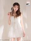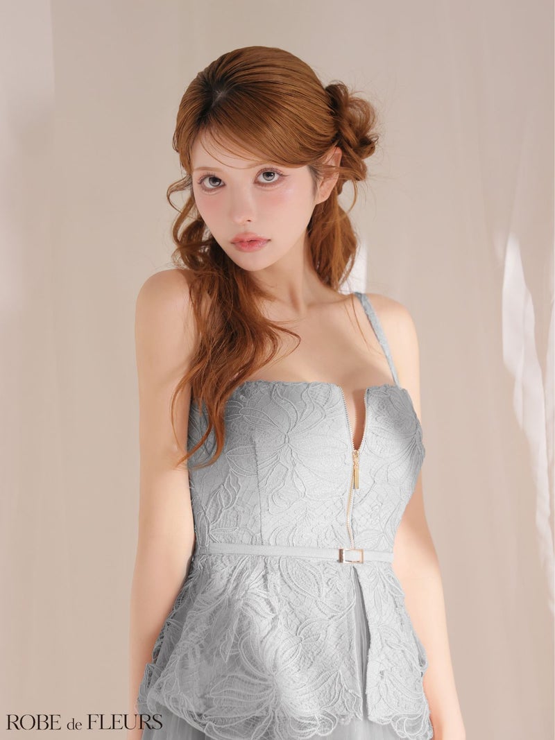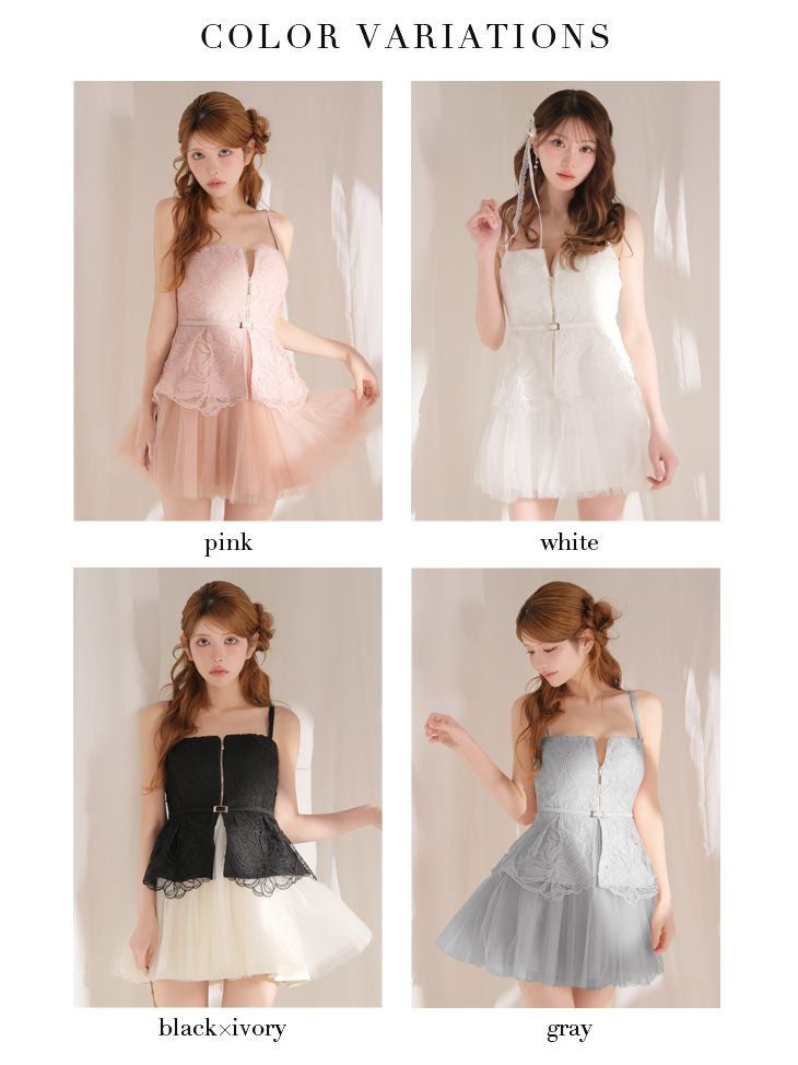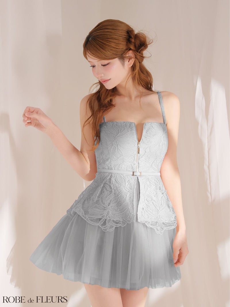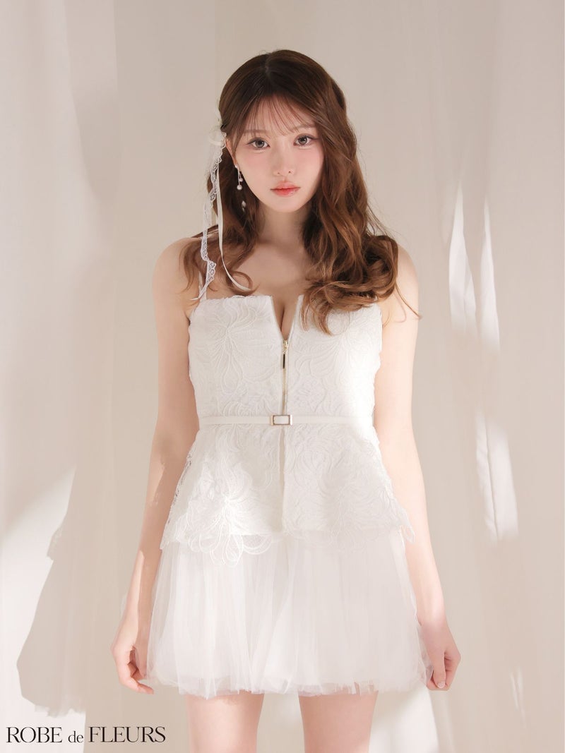 5. 予約商品【4月中旬入荷予定】[ROBEdeFLEURS/ローブドフルール] 高級 ブランド Aラインミニドレス キャミソール 谷間 ジップ ペプラム ウエストベルト フラワーレース チュール切替