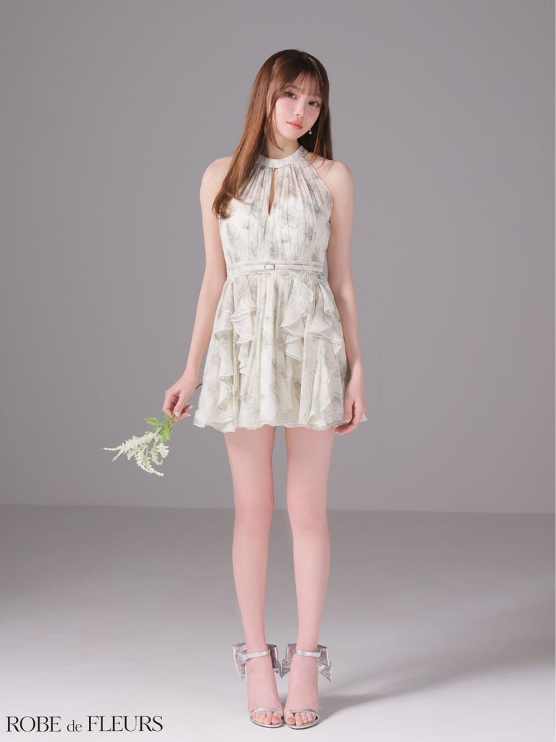 別々で着ても可愛いセットアップドレス♡ [ROBEdeFLEURS/ローブドフルール] 高級 ブランド Aラインミニドレス セットアップ ホルターネック 谷間 花柄シフォン ベルト付き バストカット