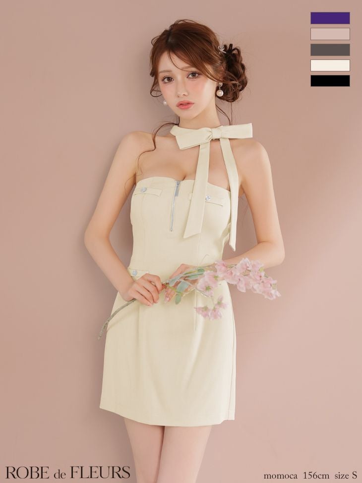 4. [ROBEdeFLEURS/ローブドフルール] 高級 ホルターネック バストジップ ネックリボン 谷間魅せ タイトミニドレス (伊藤舞雪着用)