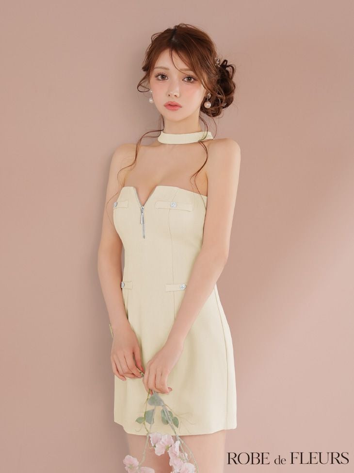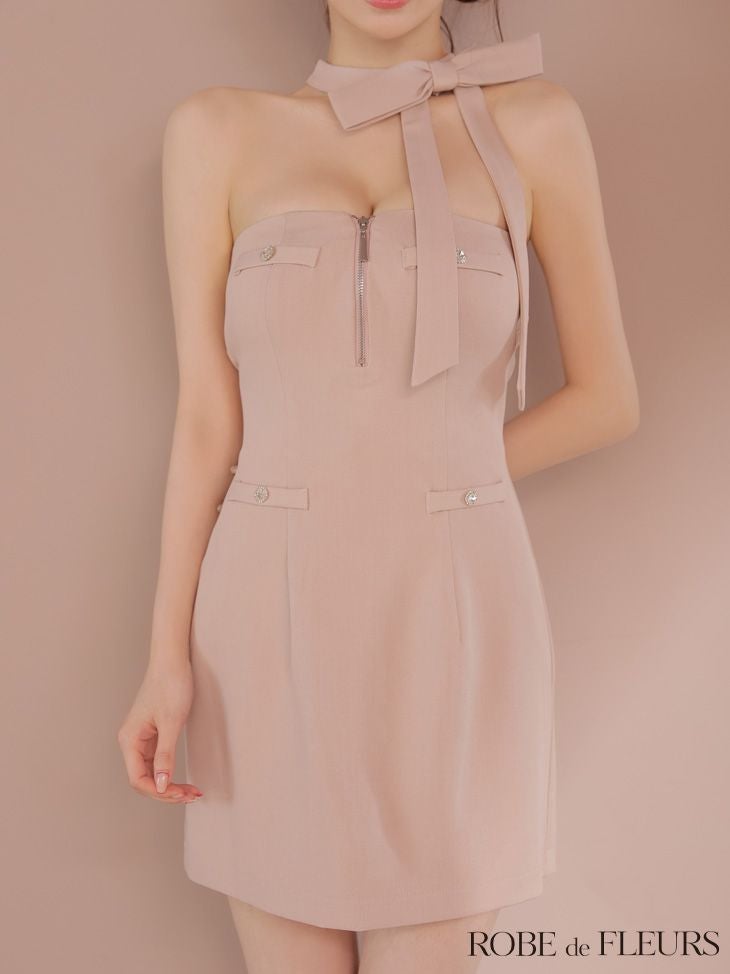フェミニンな色気を醸し出す♡ [ROBEdeFLEURS/ローブドフルール] 高級 ホルターネック バストジップ ネックリボン 谷間魅せ タイトミニドレス (伊藤舞雪着用)