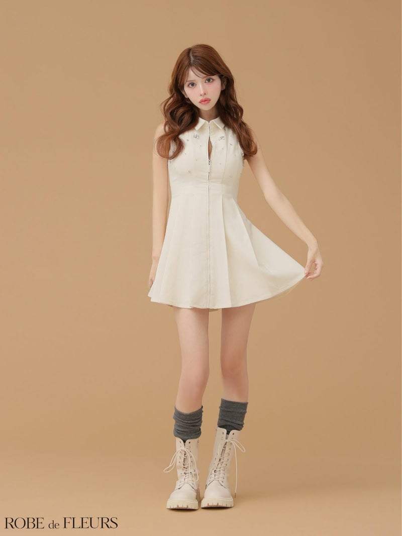 清楚ながらも華やかな印象に♡ [ROBEdeFLEURS/ローブドフルール] 高級 ブランド ワンピース Aラインミニドレス 谷間 ノースリーブ 襟付き ジップ フラワーモチーフビジュー プリーツ