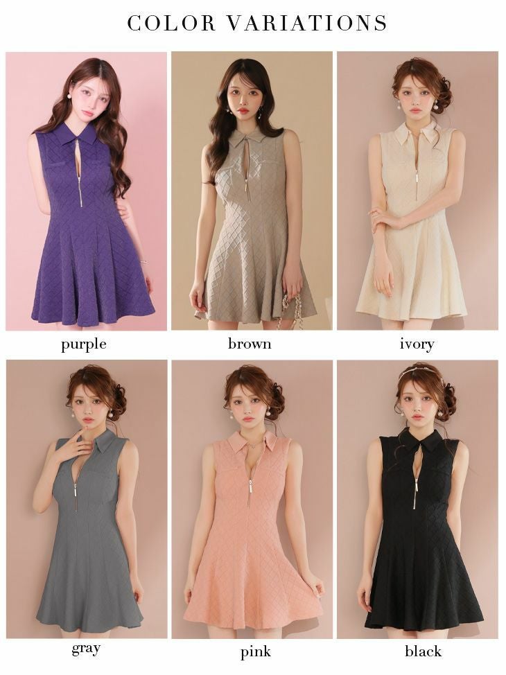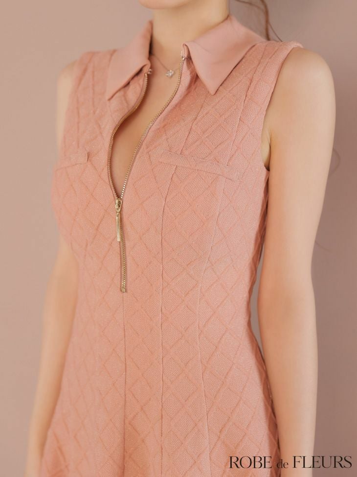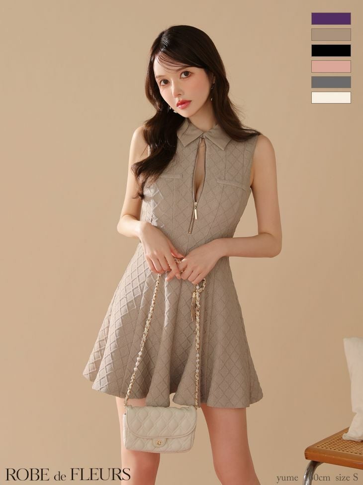 ラメ入りで上品な煌めきをプラス♡ [ROBEdeFLEURS/ローブドフルール] 高級 ブランド Aラインミニドレス 谷間 ノースリーブ 襟付き ジップ ラメ フェミニン