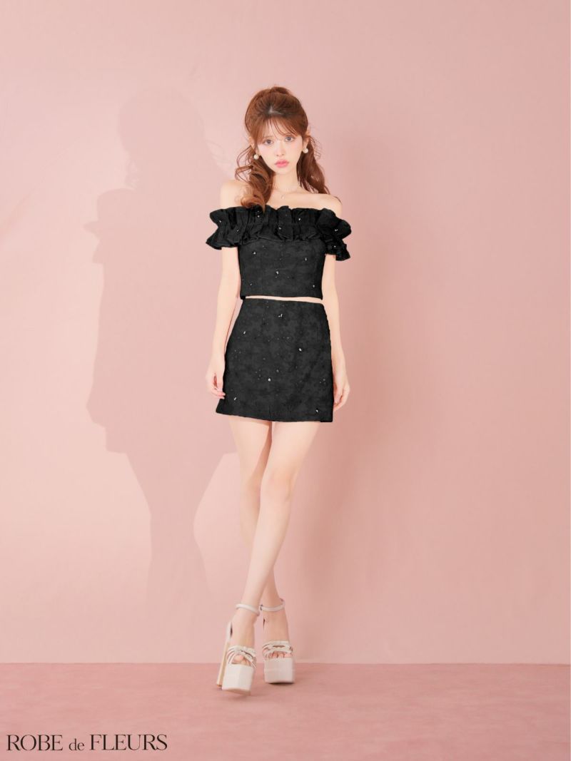 フリルで可愛く華奢見せを叶える♡ [ROBEdeFLEURS/ローブドフルール] 高級 ブランド タイトミニドレス セットアップ オフショルダー フリル フラワーレース ビジュー