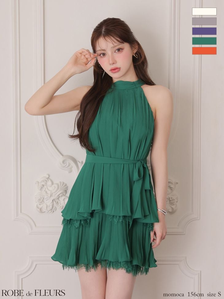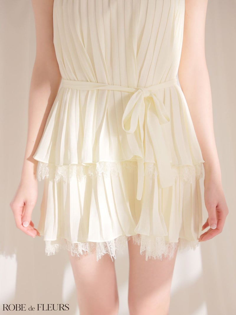 5. 予約商品【5月上旬入荷予定】[ROBEdeFLEURS/ローブドフルール] 高級 ブランド Aラインミニドレス ホルターネック ウエストリボン プリーツ 胸元カバー レース