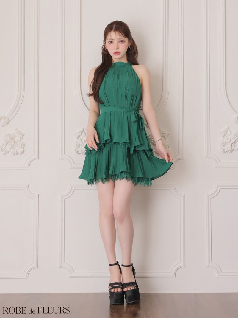 プリーツが上品さを引き立てる♡ 予約商品【5月上旬入荷予定】[ROBEdeFLEURS/ローブドフルール] 高級 ブランド Aラインミニドレス ホルターネック ウエストリボン プリーツ 胸元カバー レース