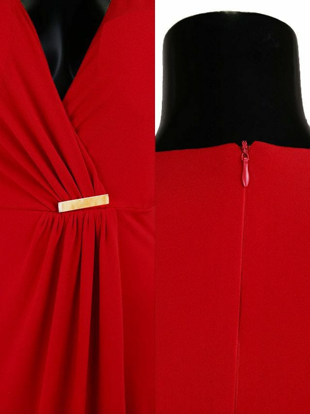 5. Vネック ラップ風 袖あり タイト 膝丈ドレス (Sサイズ~XXLサイズ) (さくりな/キャバドレス着用)