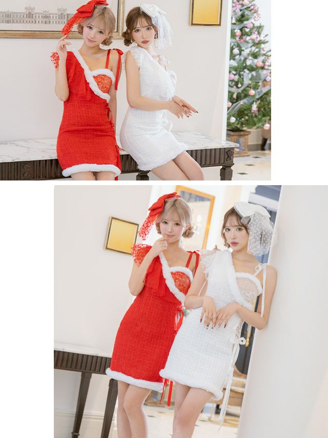 サンタコス 2点set アシンメトリードットチュール×フラワーレースリボントッピングツイードタイトサンタコスプレドレスの全身フロントバック画像