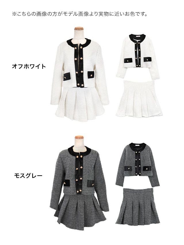 ベロアパイピングゴールドボタンノーカラージャケット×プリーツ入りハイウエストフレアスカートツイードラメセットアップスーツのカラバリ画像