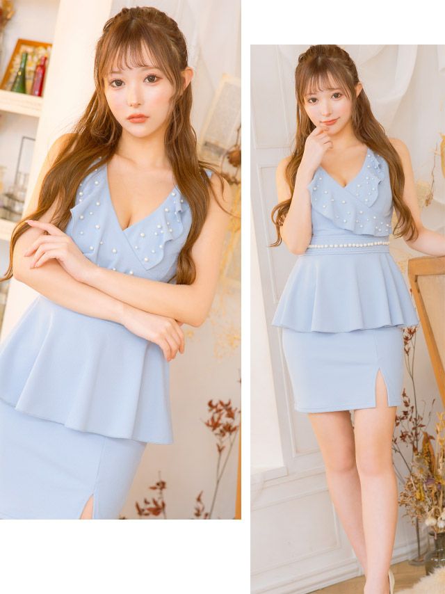 フェミニンな可愛さたっぷりな女子力UPドレス♪ [SALE] ノースリーブ胸元フリルパールペプラムタイトミニドレス (Sサイズ~XXXXLサイズ) (せいせい 聖菜/キャバドレス着用)