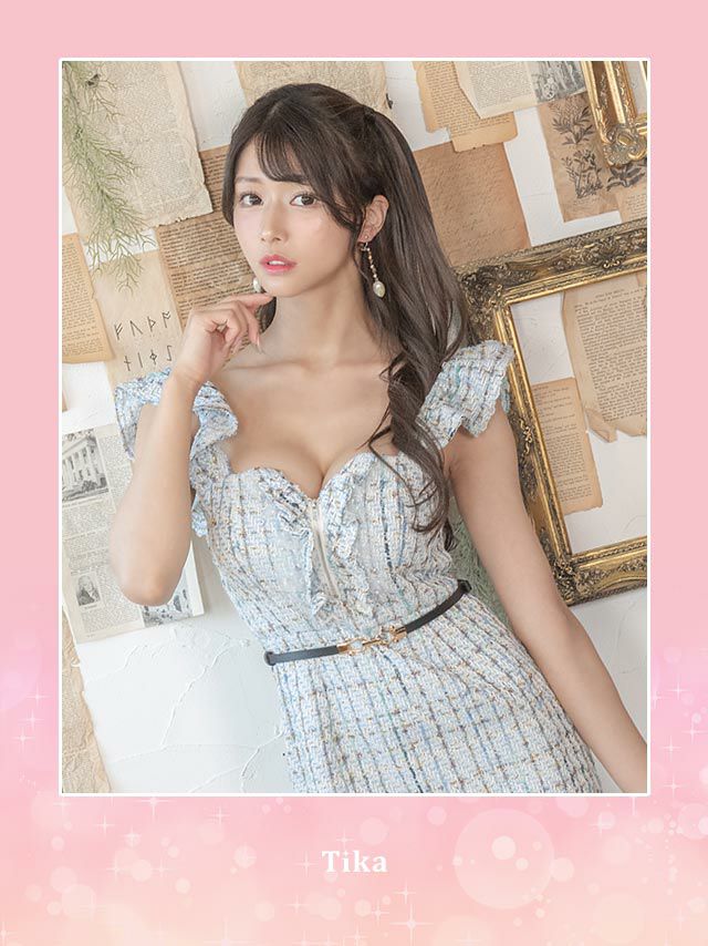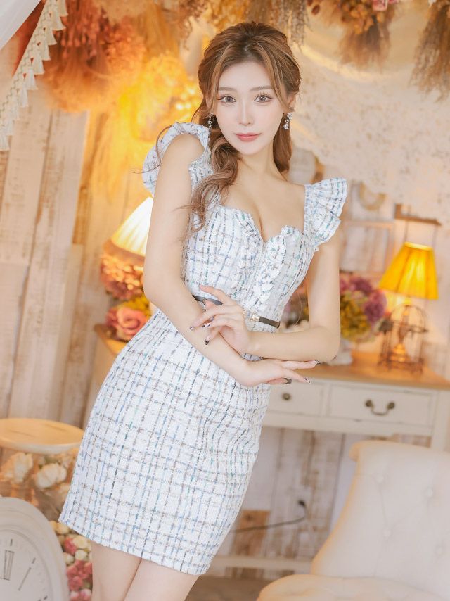 ツイード×チェック柄で映える♪ [SALE] ベルト付きフリル袖チェック柄ツイードフロントジップノースリーブタイトミニドレス (Sサイズ~XXLサイズ) (せいせい/キャバドレス着用)