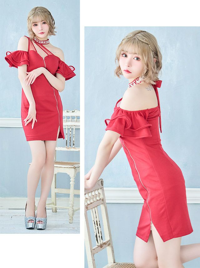 ビジュー付きチョーカーデコルテカットアウト肩あきフリル袖フロントジップストレッチタイトミニドレスのカラーバリエーション