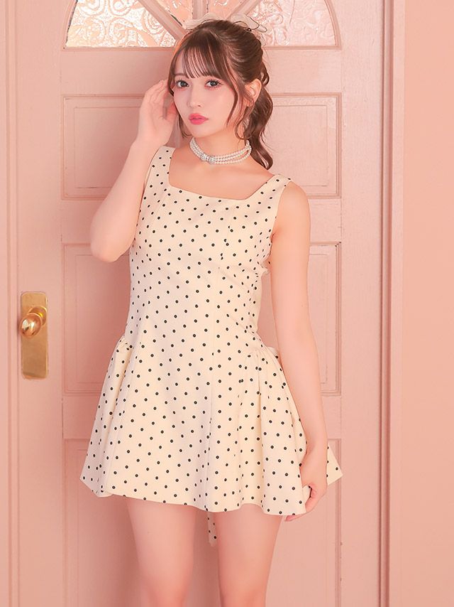 ワンピース Aライン ミニドレス ノースリーブ 上品 背中魅せ ドット柄 ピンドット バックリボン 同伴 キャバドレスの商品特徴1